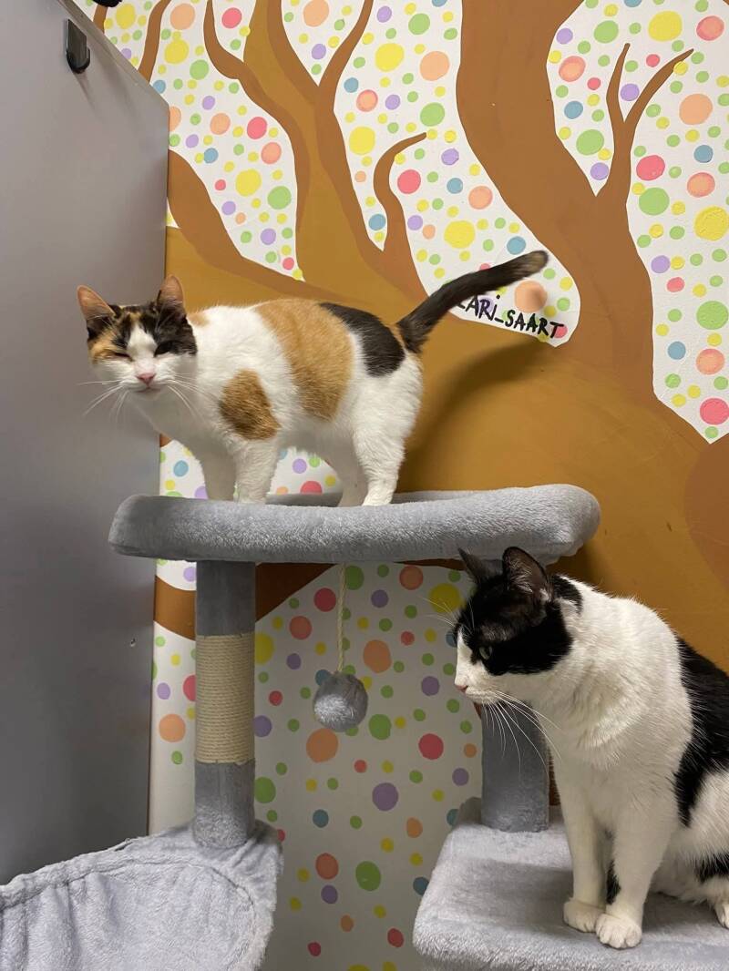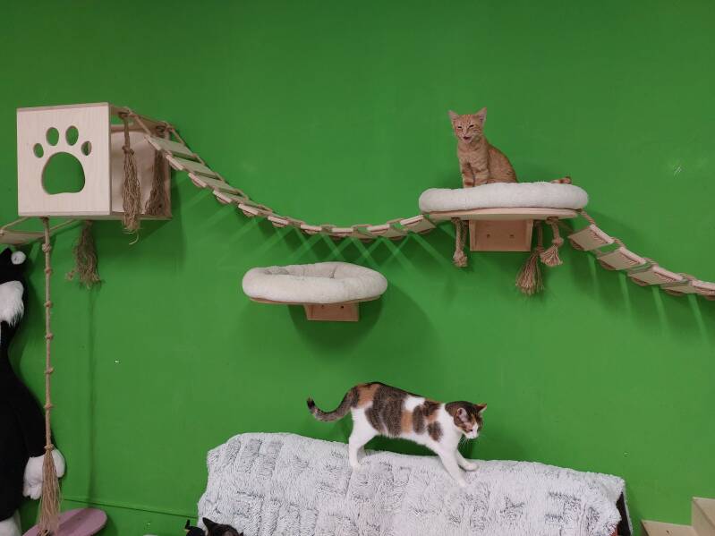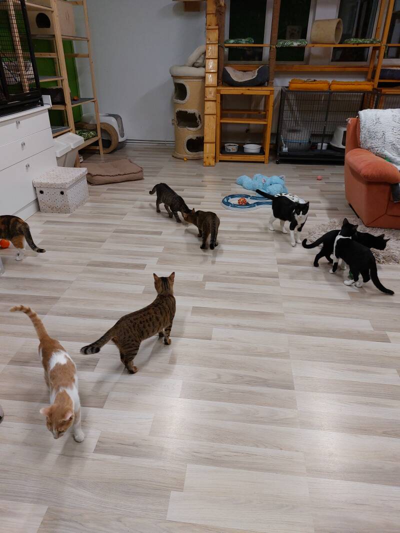 - Eine Quarantänestation für noch ungeimpfte oder frisch eingetroffene Tiere mit Schlafplätzen, Kratzbäumen und Einzelboxen